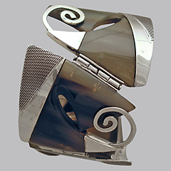 Материали: рог, сребро, седеф, естествени перли, планински кристал.